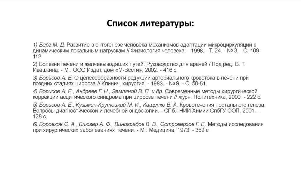 Список литературы:1) Берг М. Д. Развитие в онтогенезе человека механизмов адаптации микроциркуляции к