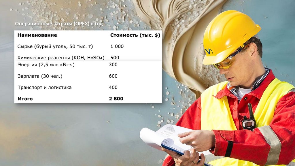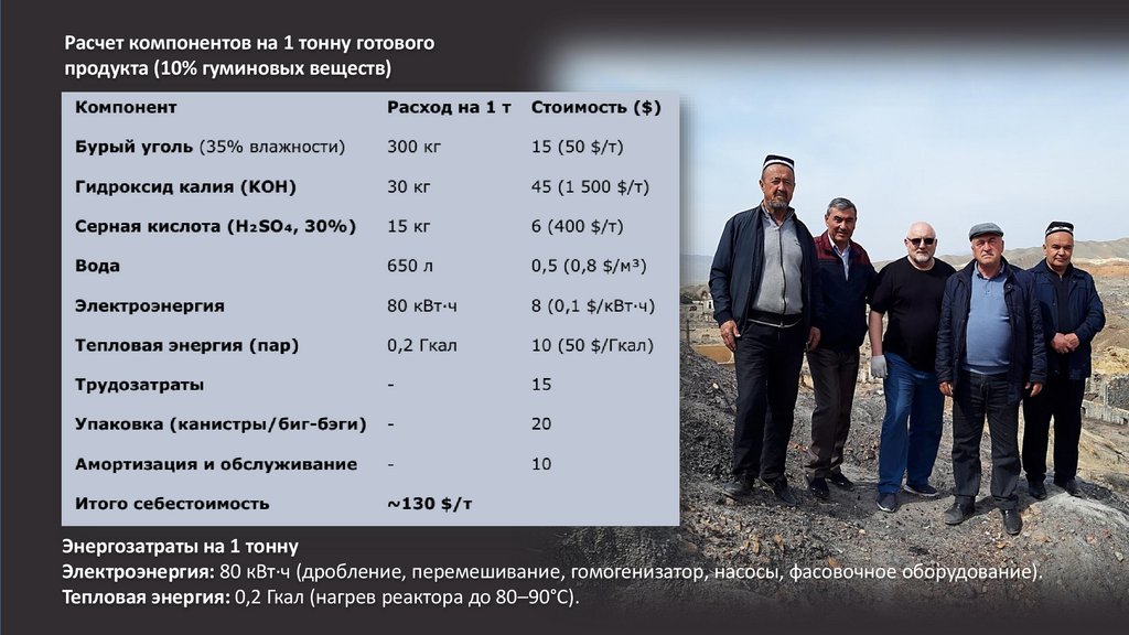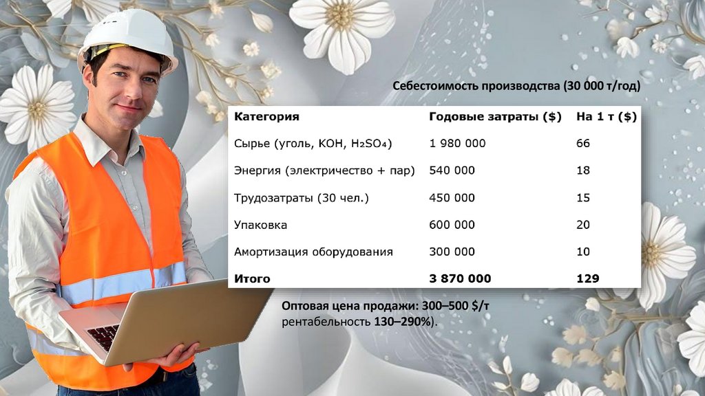 Себестоимость производства (30 000 т/год)Оптовая цена продажи: 300–500 $/т