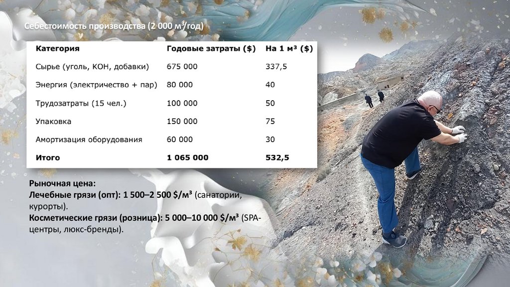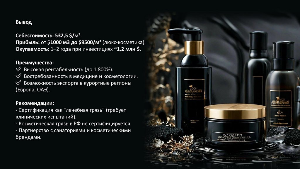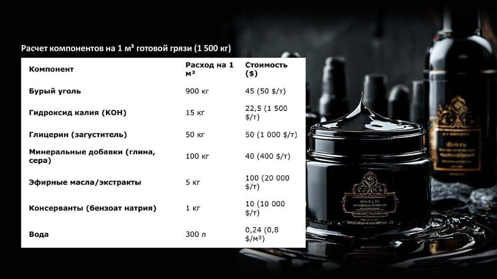 Косметические грязи (розница): 5 000–10 000 $/м³ (SPAцентры, люкс-бренды).