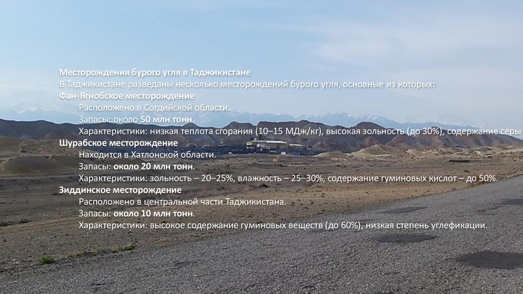 Месторождения бурого угля в ТаджикистанеВ Таджикистане разведаны несколько месторождений бурого угля, основные из которых: