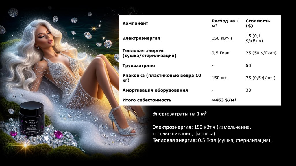 Энергозатраты на 1 м³Электроэнергия: 150 кВт·ч (измельчение,