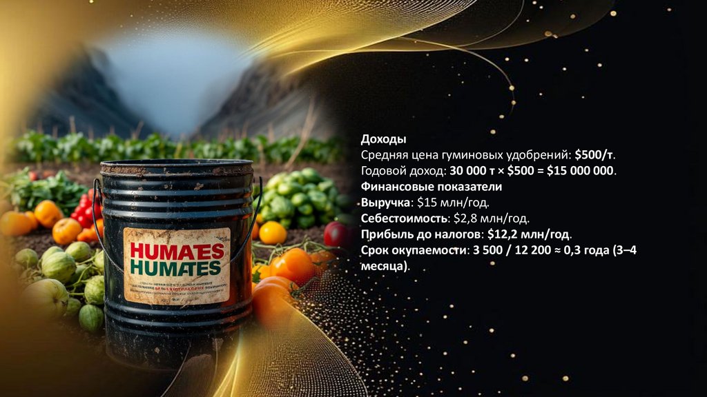 ДоходыСредняя цена гуминовых удобрений: $500/т.