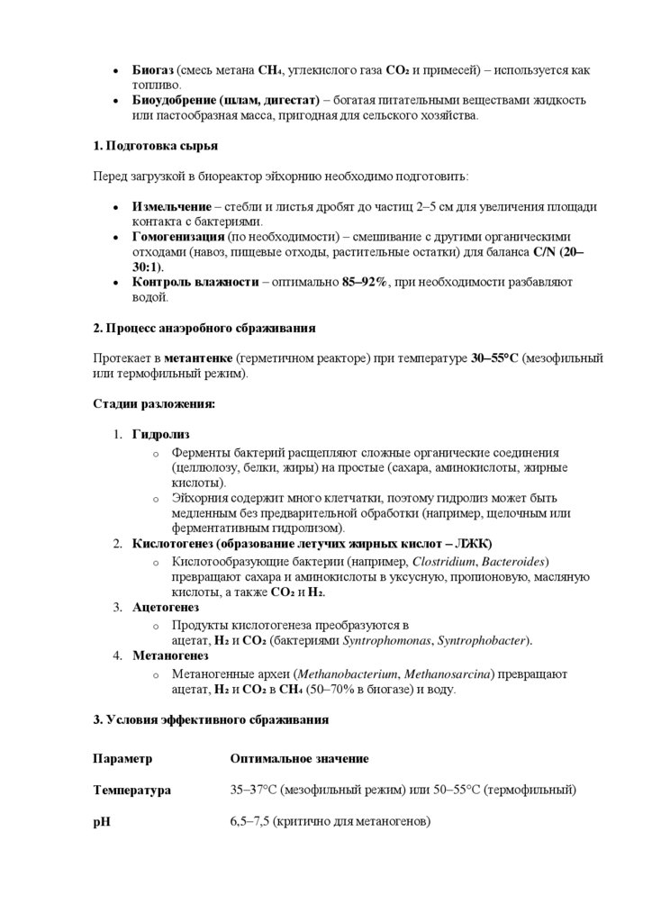 o Выделяется метан (используется как топливо), а оставшийся шлам – богатое