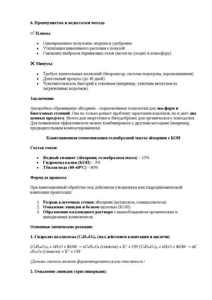 o Измельчённая эйхорния помещается в метантенк, где бактерии разлагают её