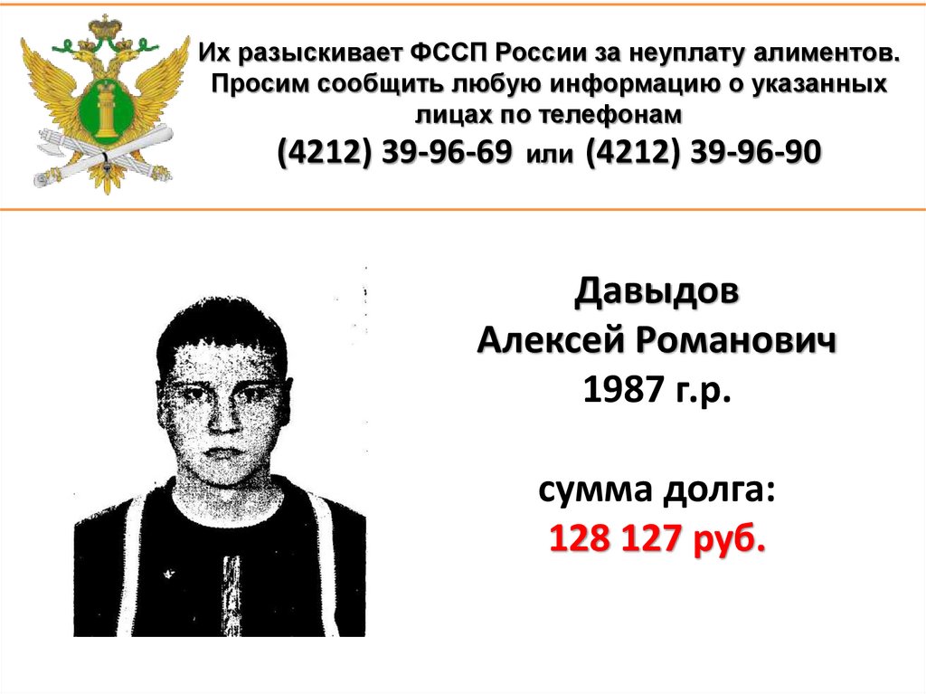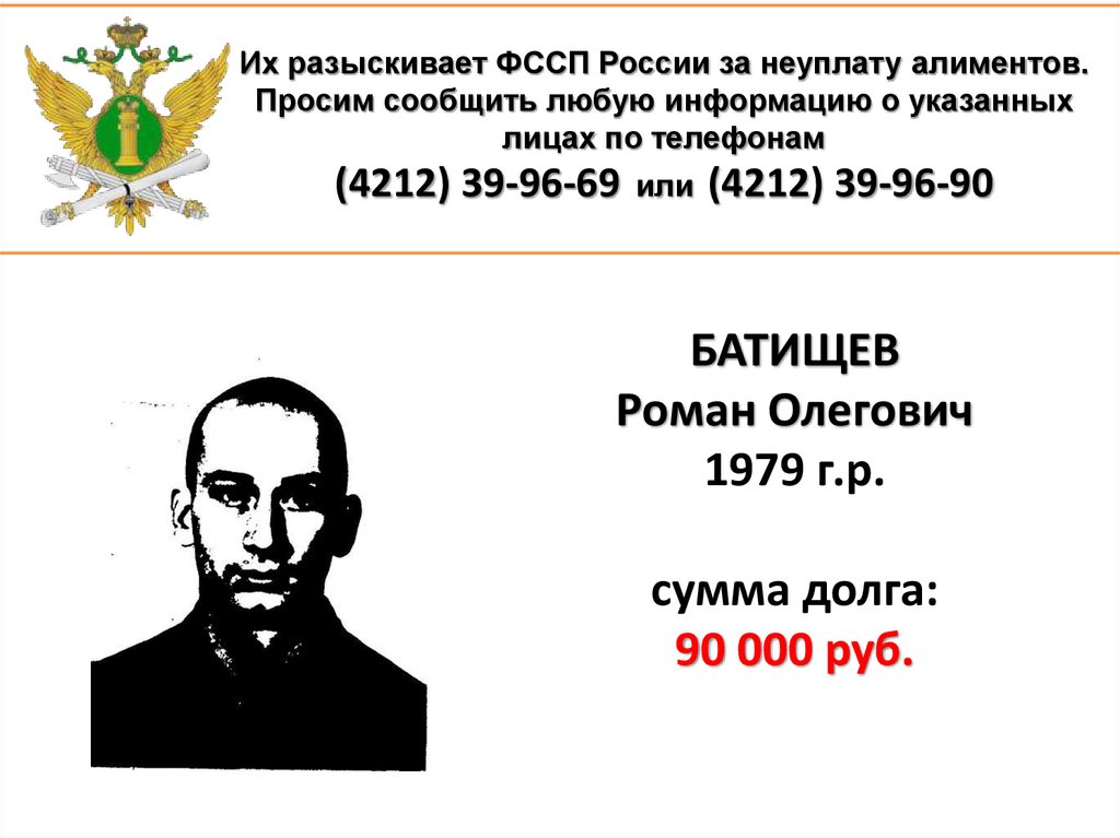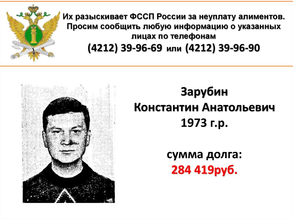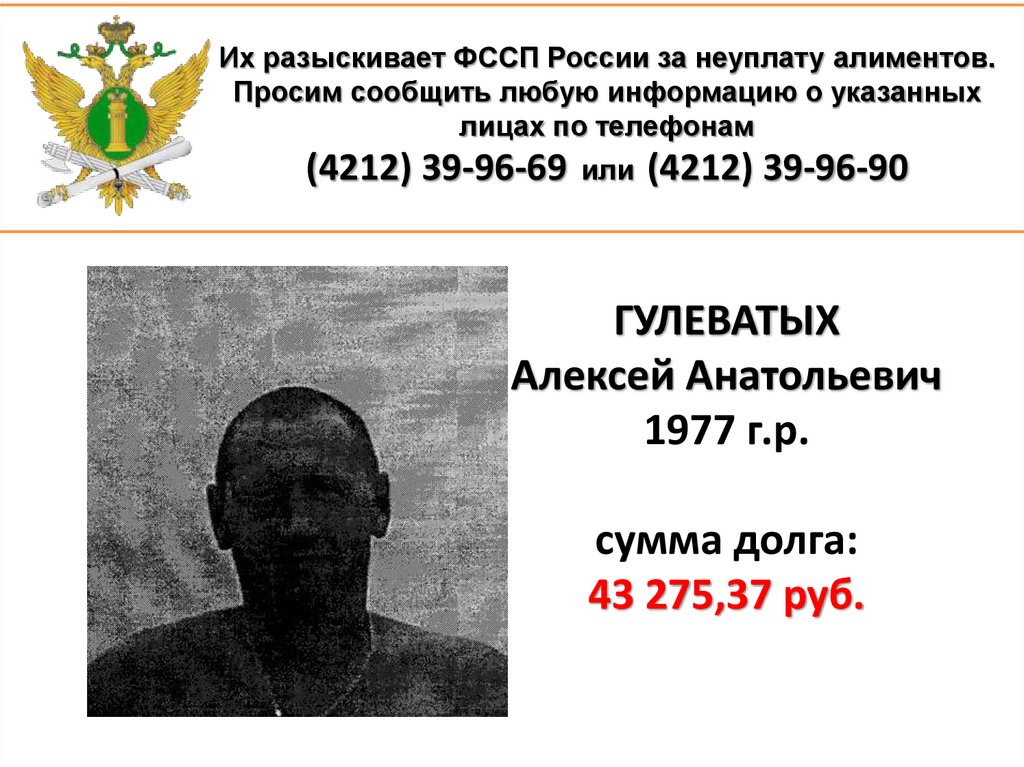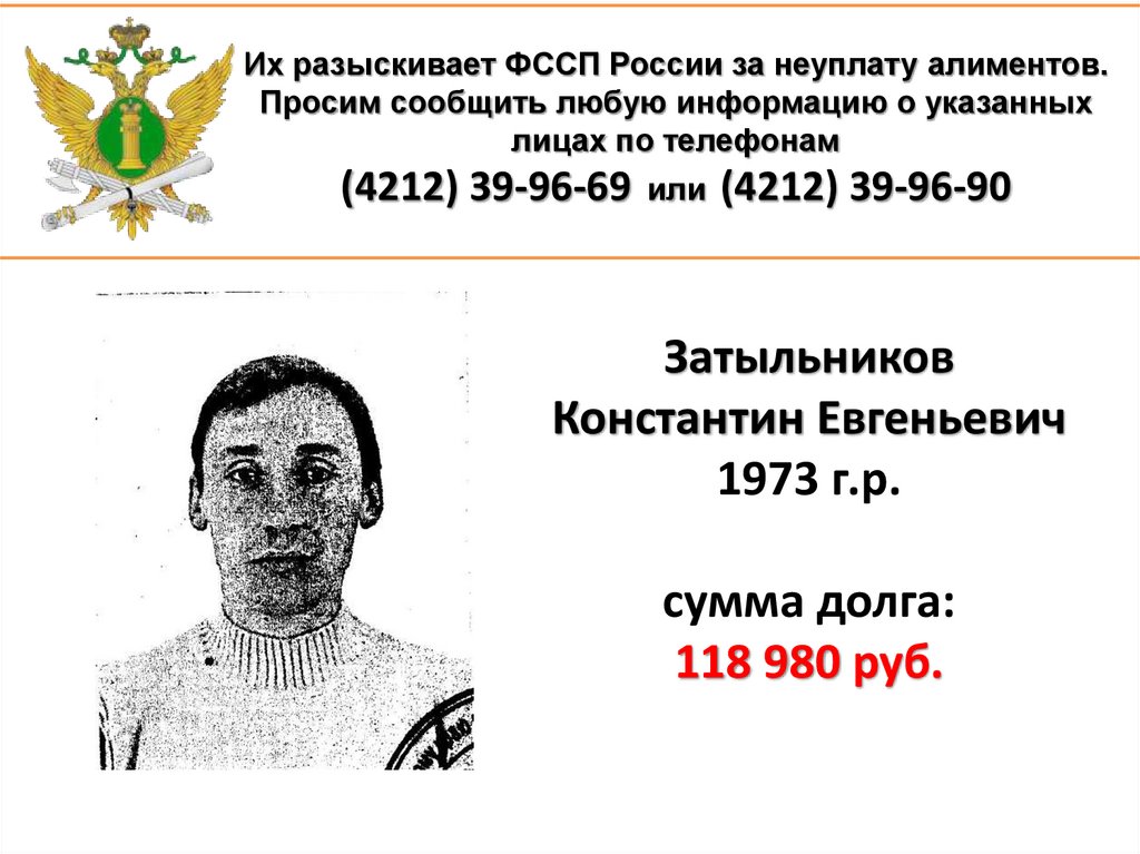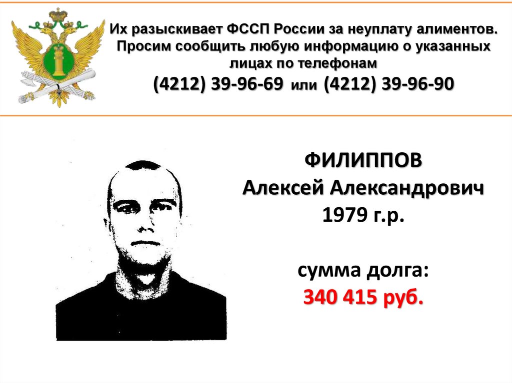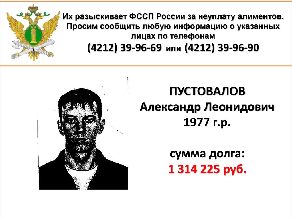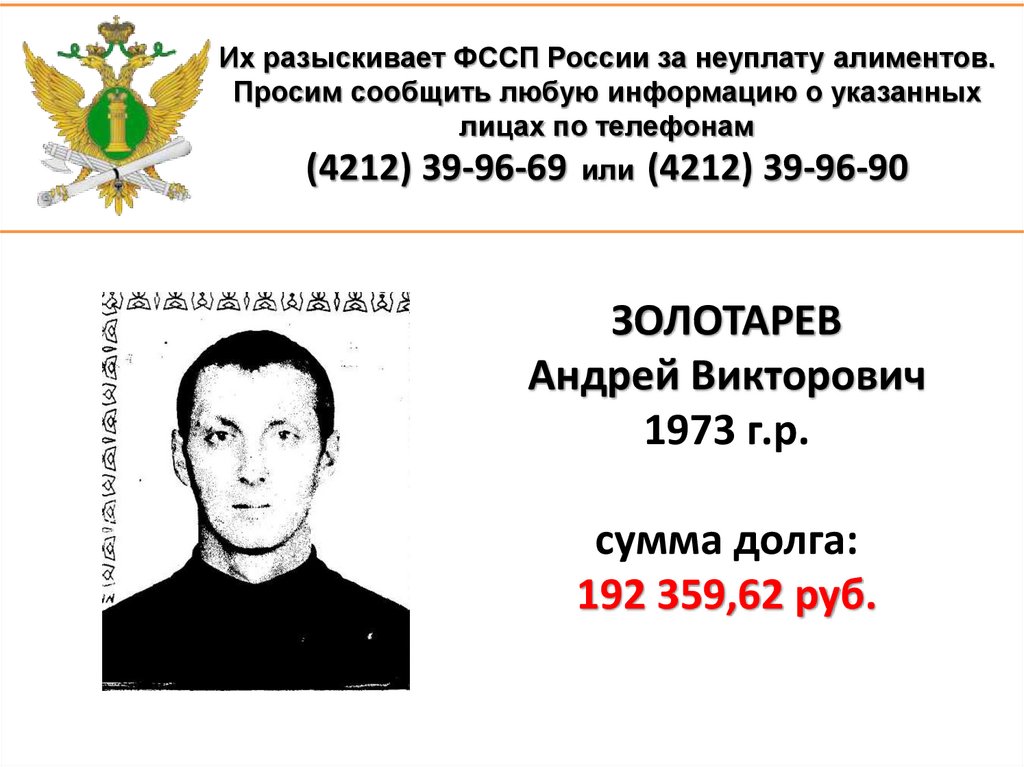 1. Их разыскивает ФССП России за неуплату алиментов. Просим сообщить любую информацию о указанных лицах по телефонам (4212)