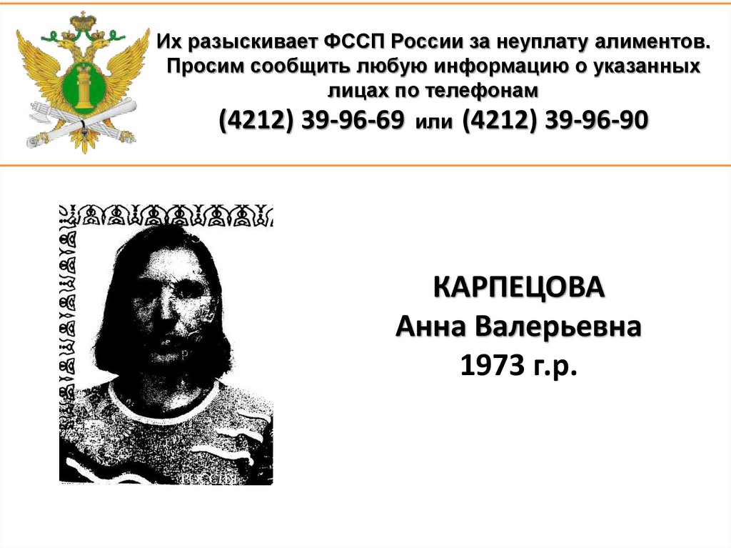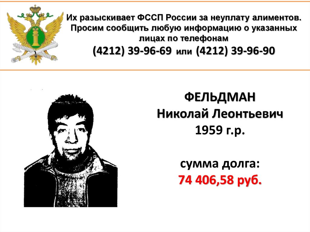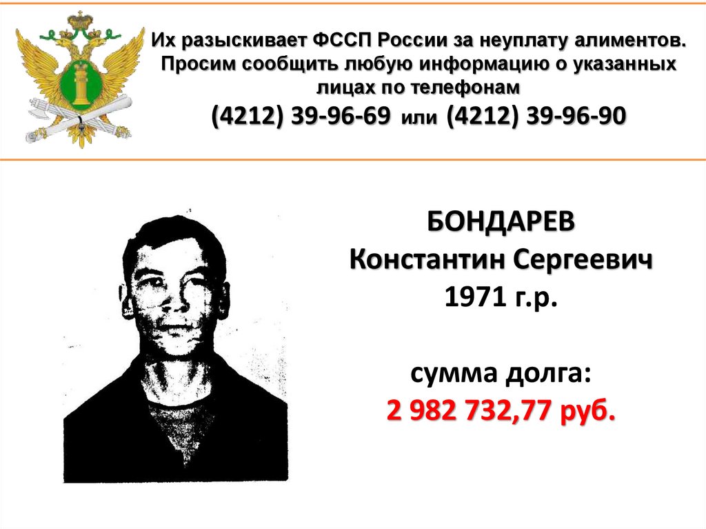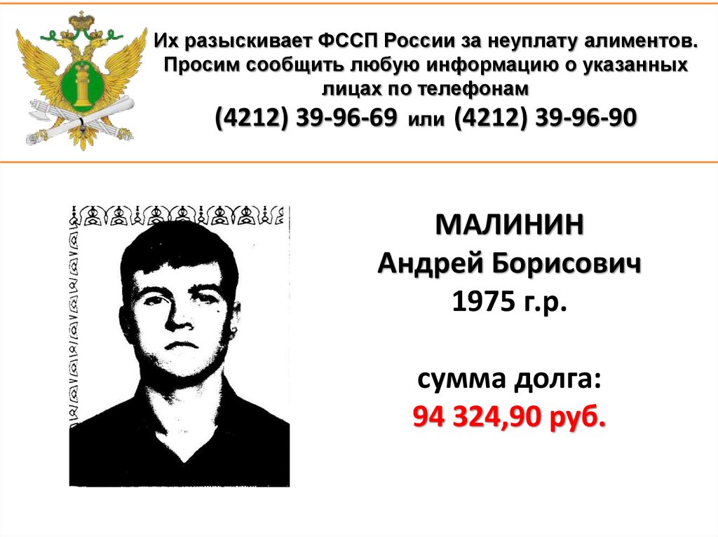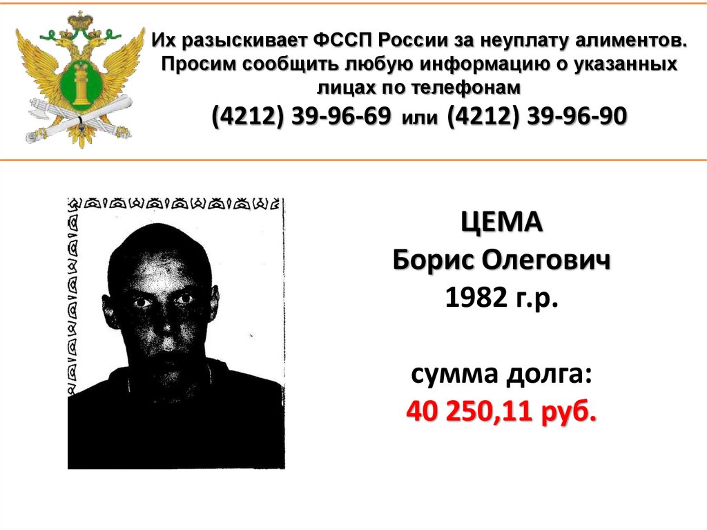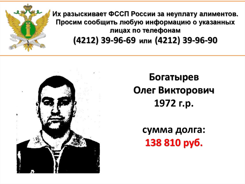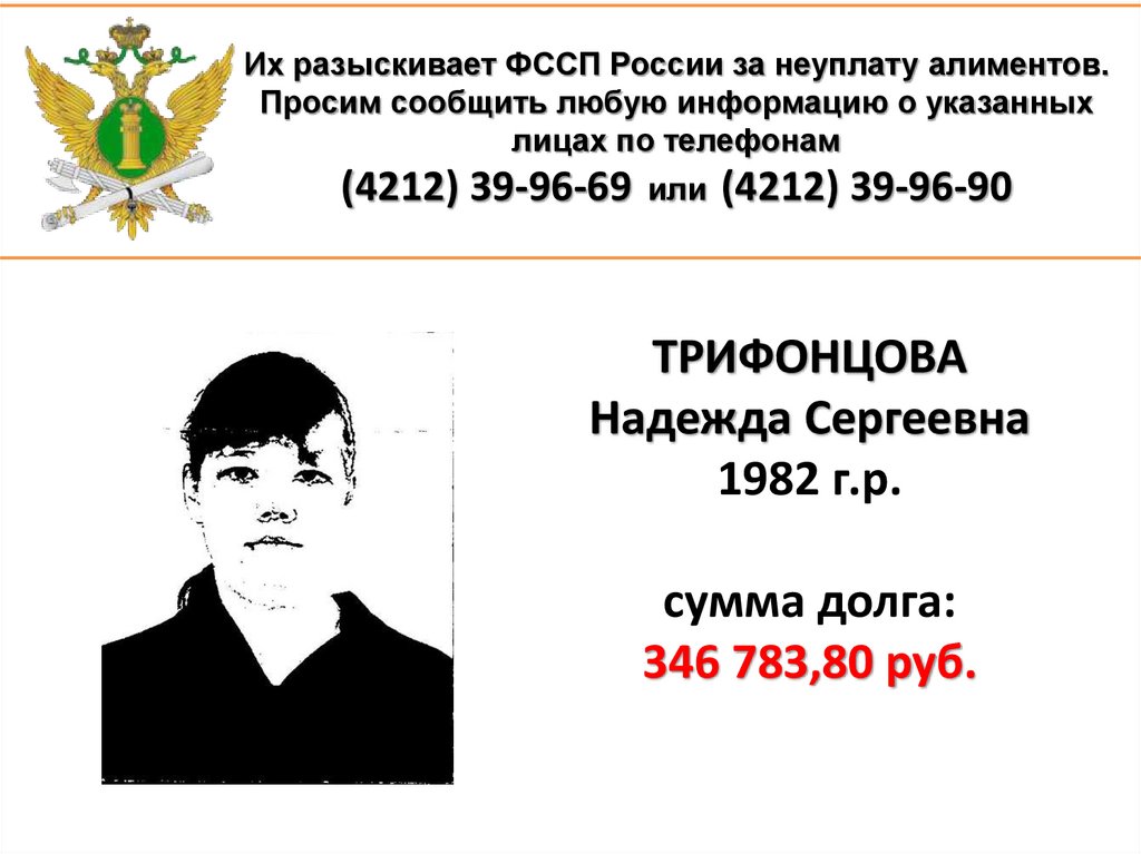 1. Их разыскивает ФССП России за неуплату алиментов. Просим сообщить любую информацию о указанных лицах по телефонам (4212)