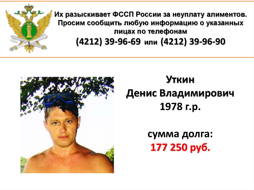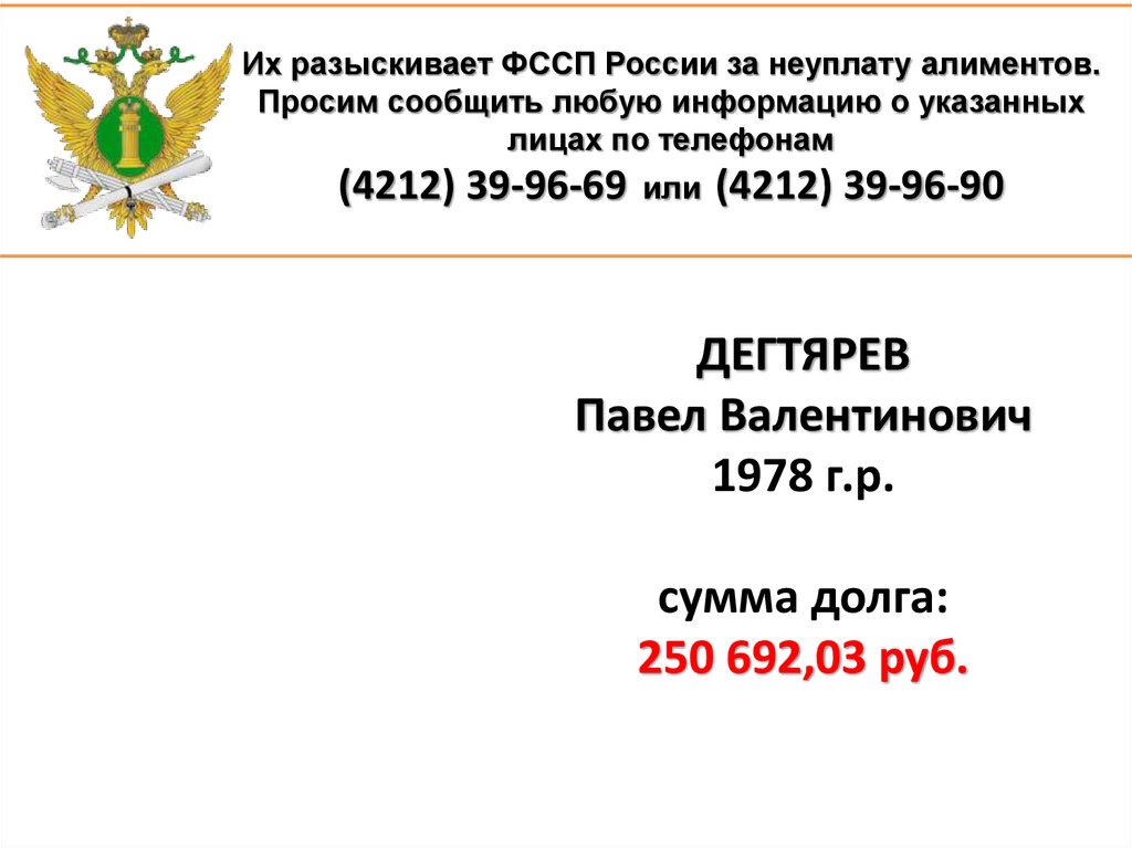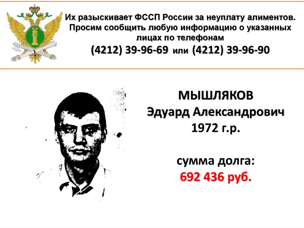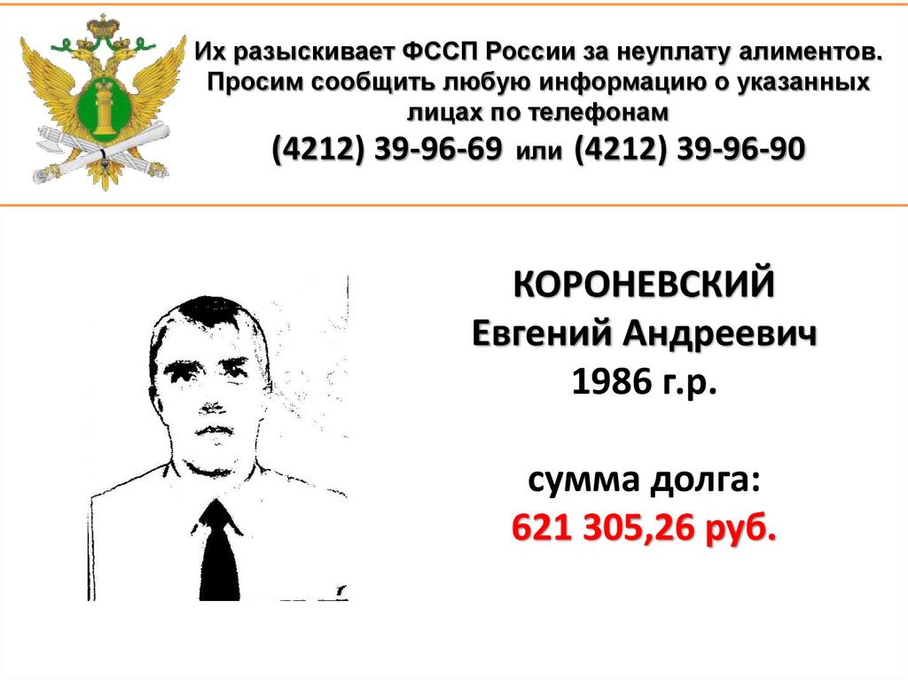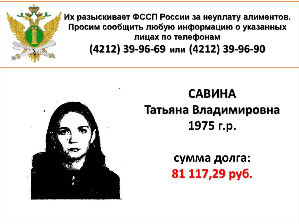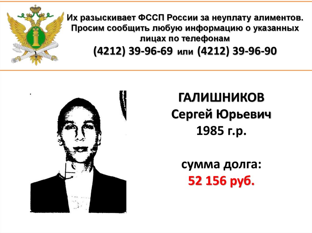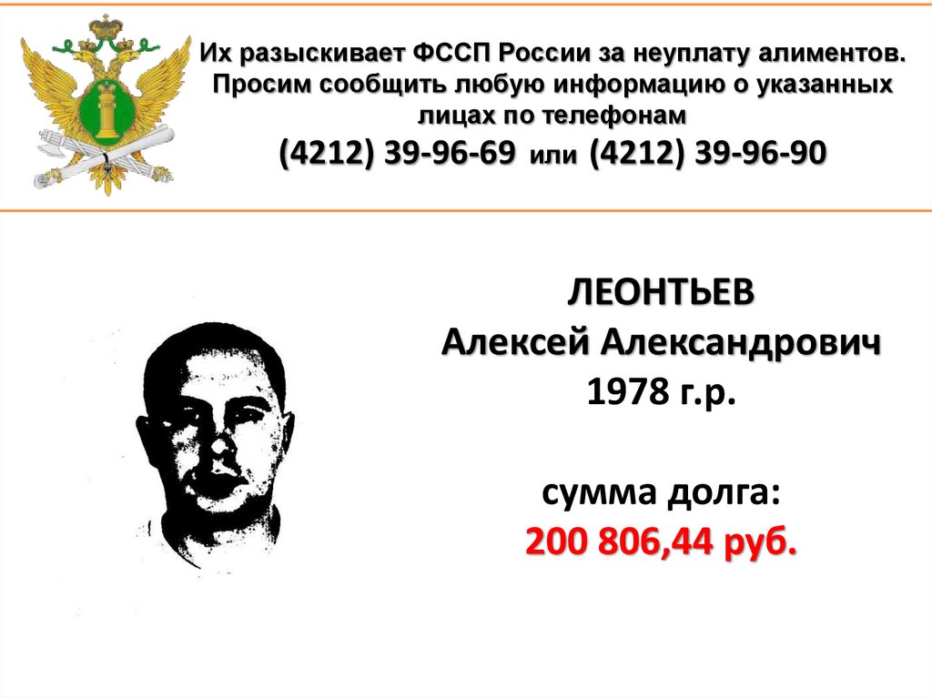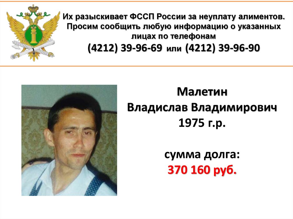 1. Их разыскивает ФССП России за неуплату алиментов. Просим сообщить любую информацию о указанных лицах по телефонам (4212)