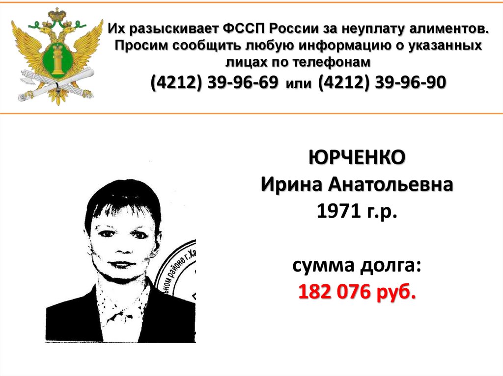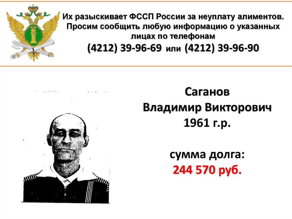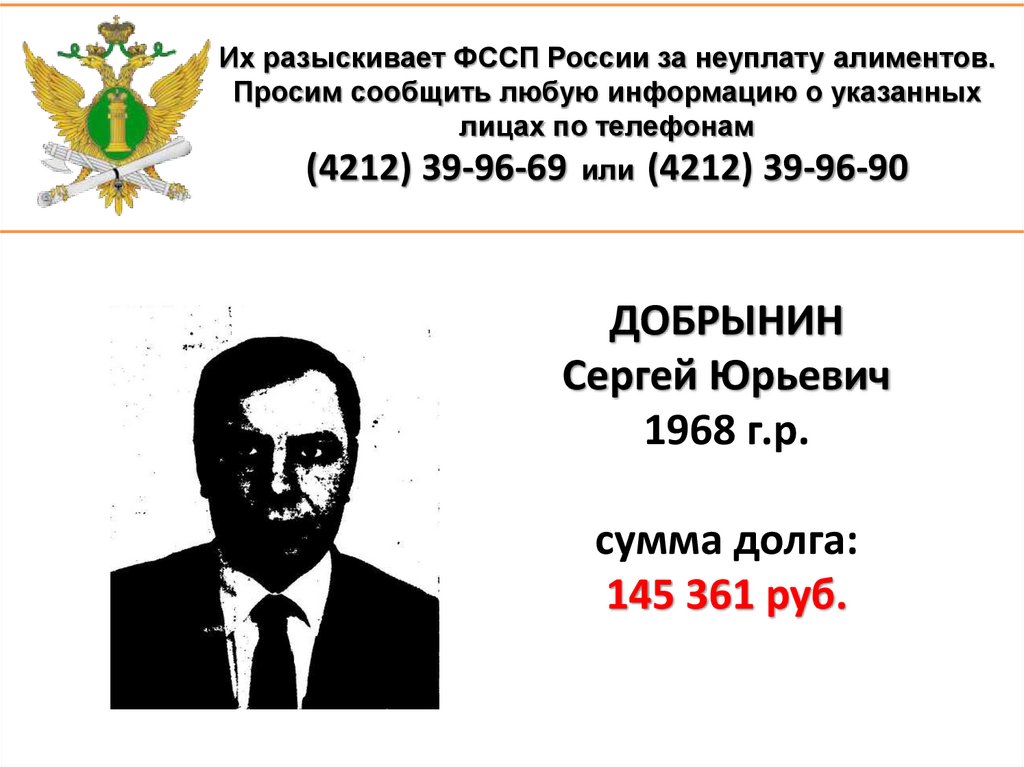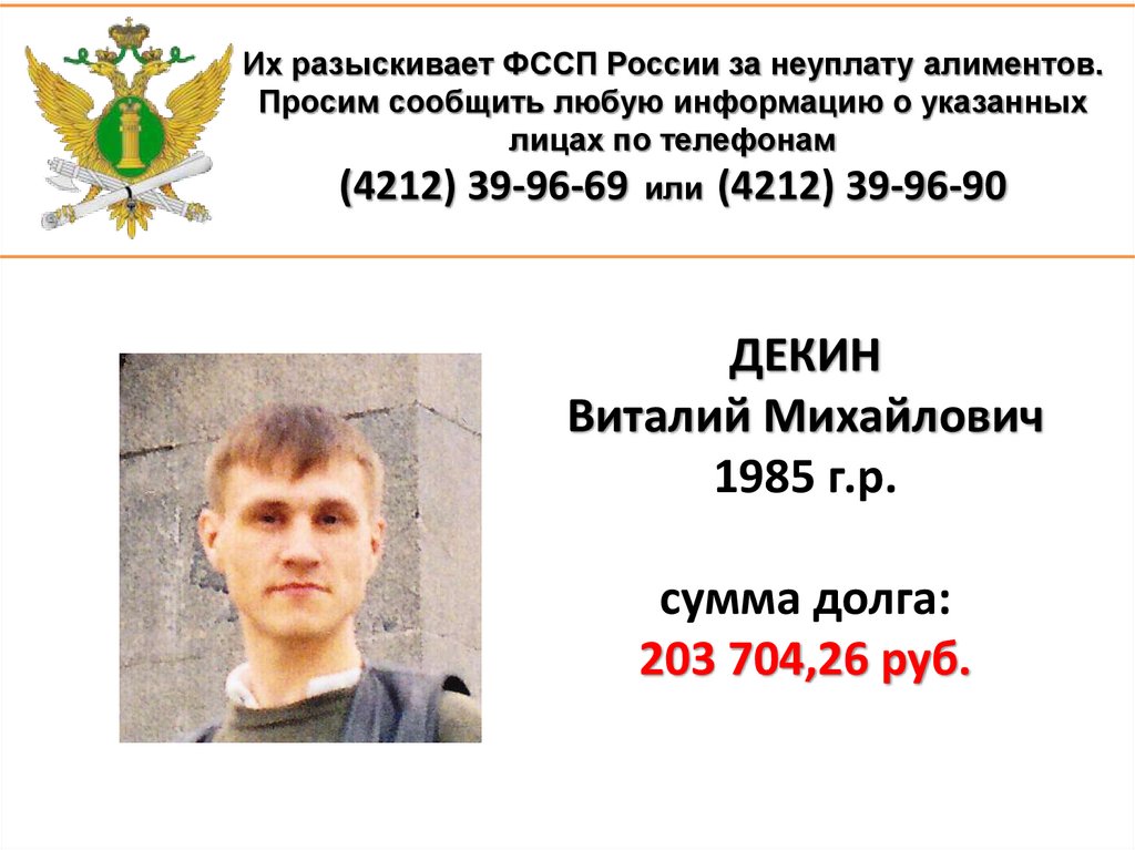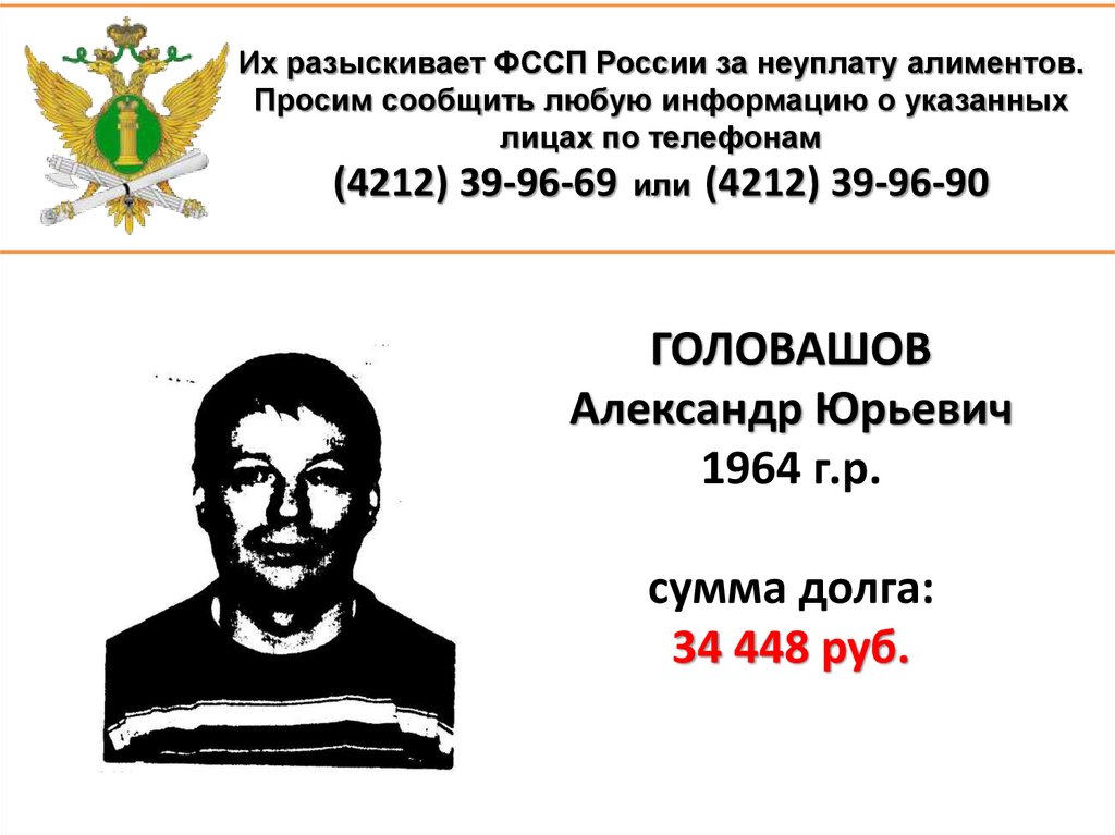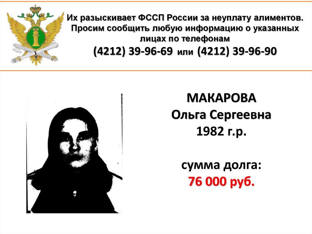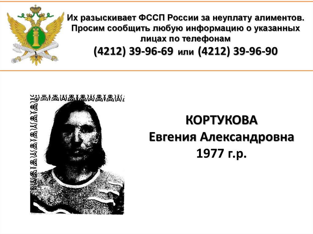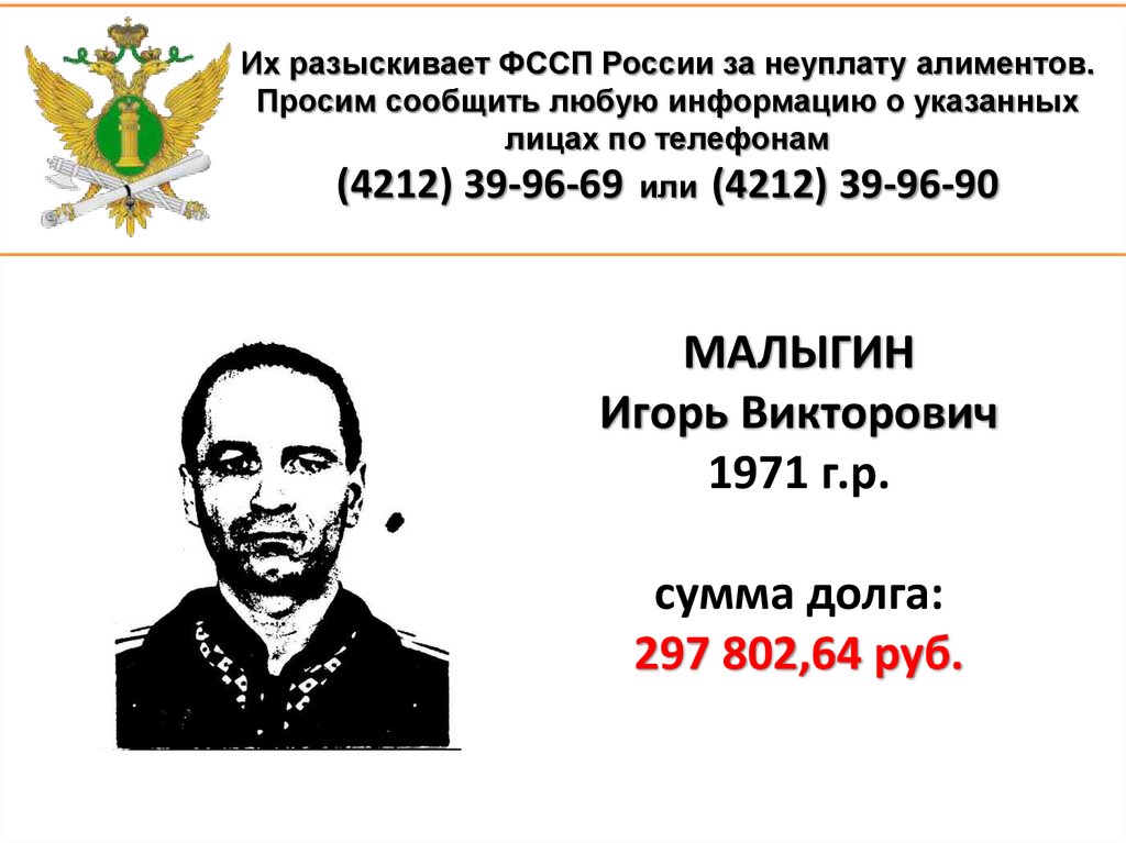 1. Их разыскивает ФССП России за неуплату алиментов. Просим сообщить любую информацию о указанных лицах по телефонам (4212)