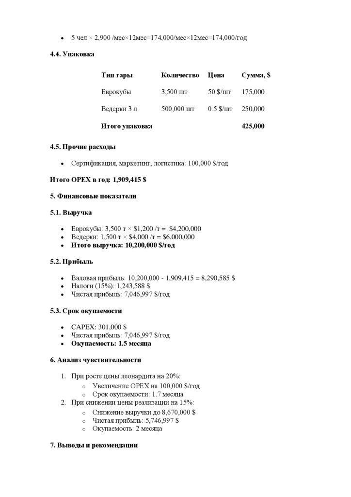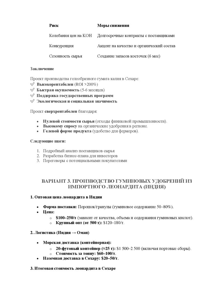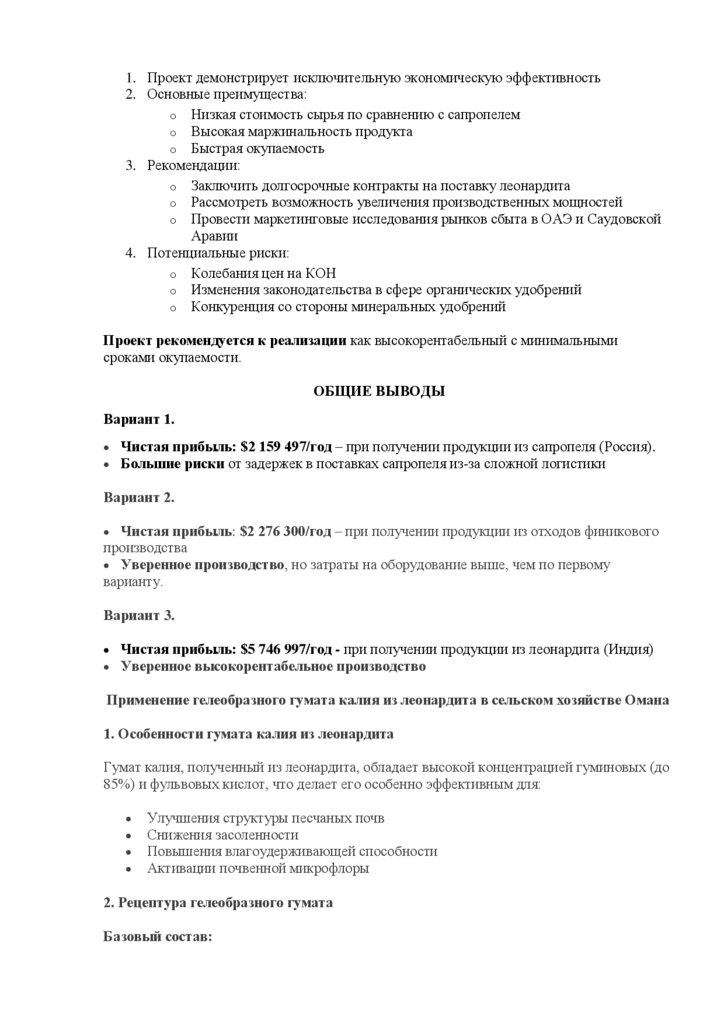 Чистая прибыль: $5 746 997/год - при получении продукции из леонардита (Индия)