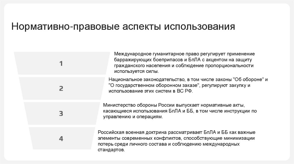 Нормативно-правовые аспекты использованияМеждународное гуманитарное право регулирует применение