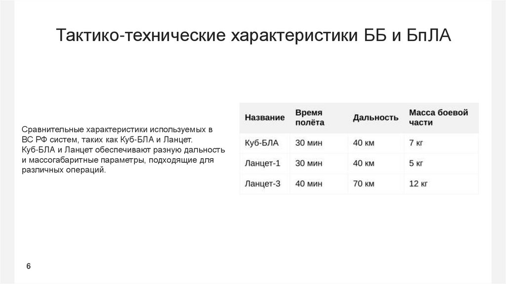 Тактико-технические характеристики ББ и БпЛАСравнительные характеристики используемых в