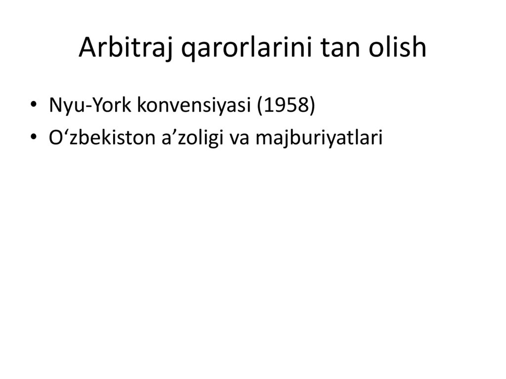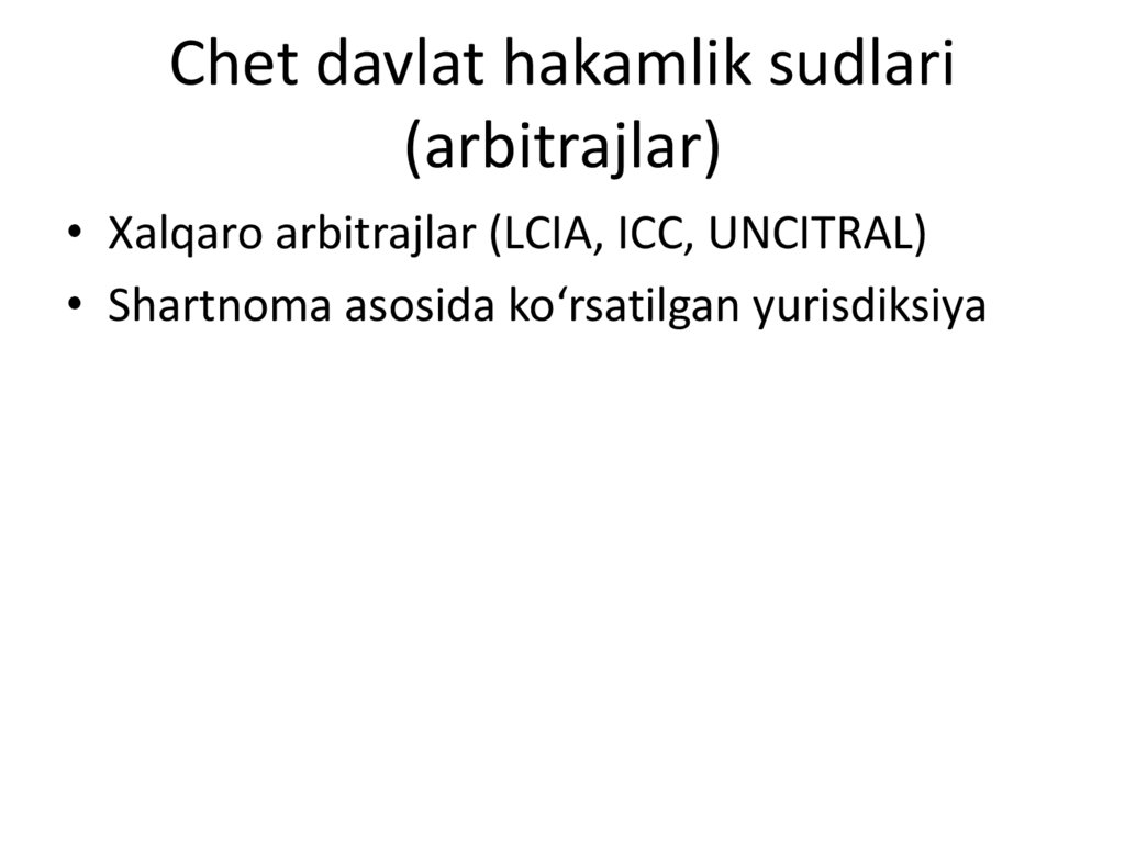 • Xalqaro arbitrajlar (LCIA, ICC, UNCITRAL)
