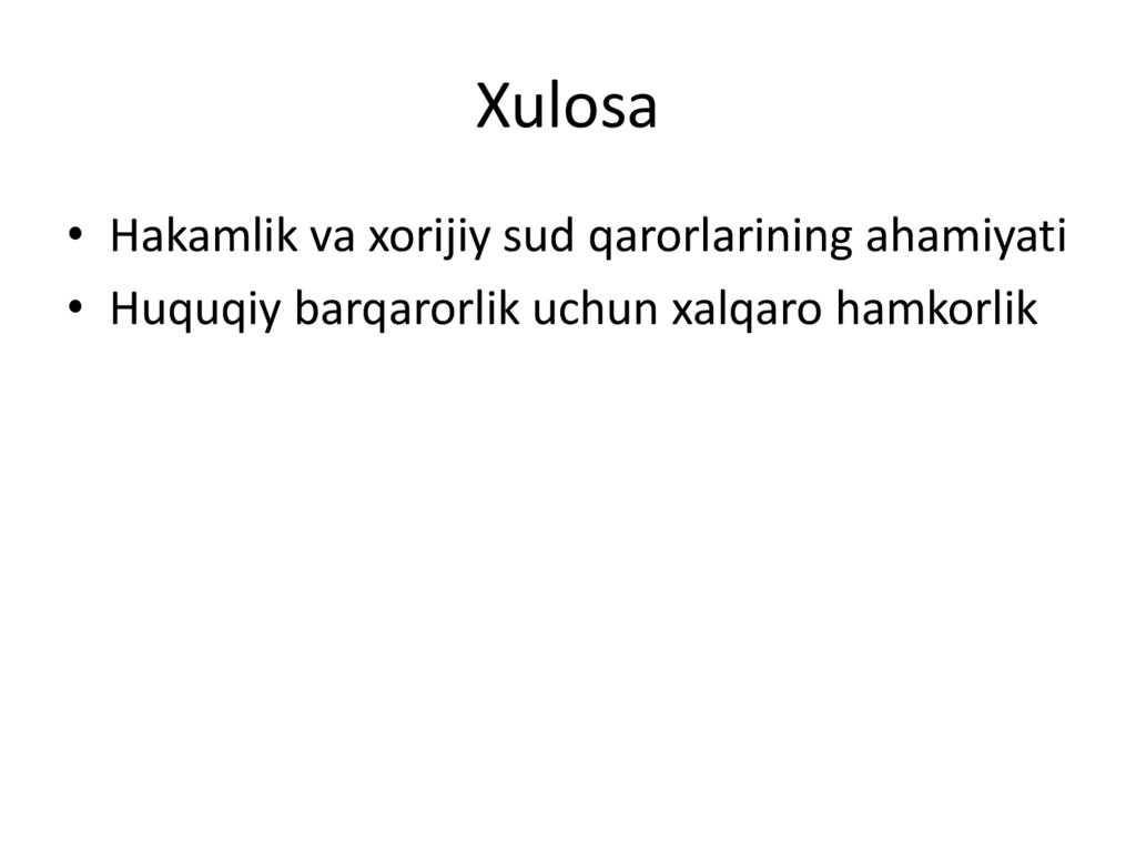 Xulosa• Hakamlik va xorijiy sud qarorlarining ahamiyati