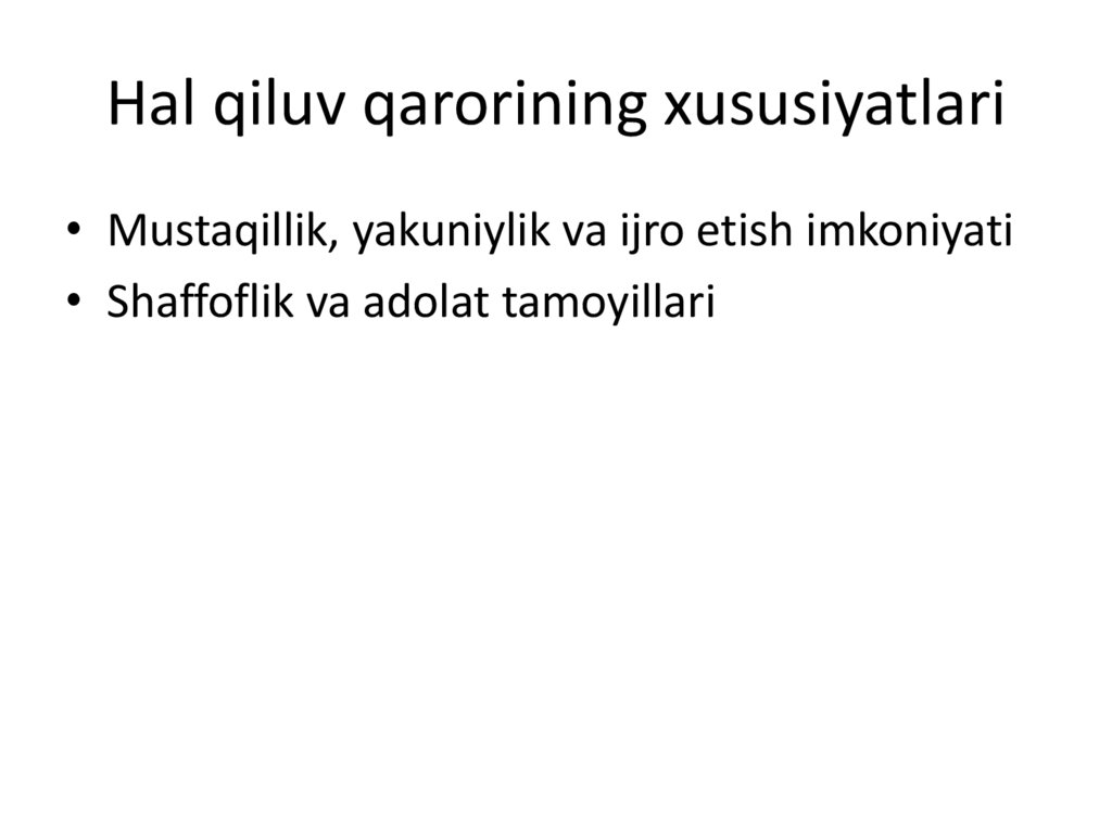 Hal qiluv qarorining xususiyatlari• Mustaqillik, yakuniylik va ijro etish imkoniyati