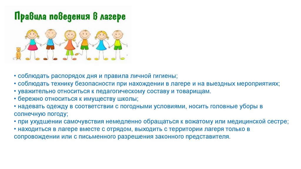 • находиться в лагере вместе с отрядом, выходить с территории лагеря только в