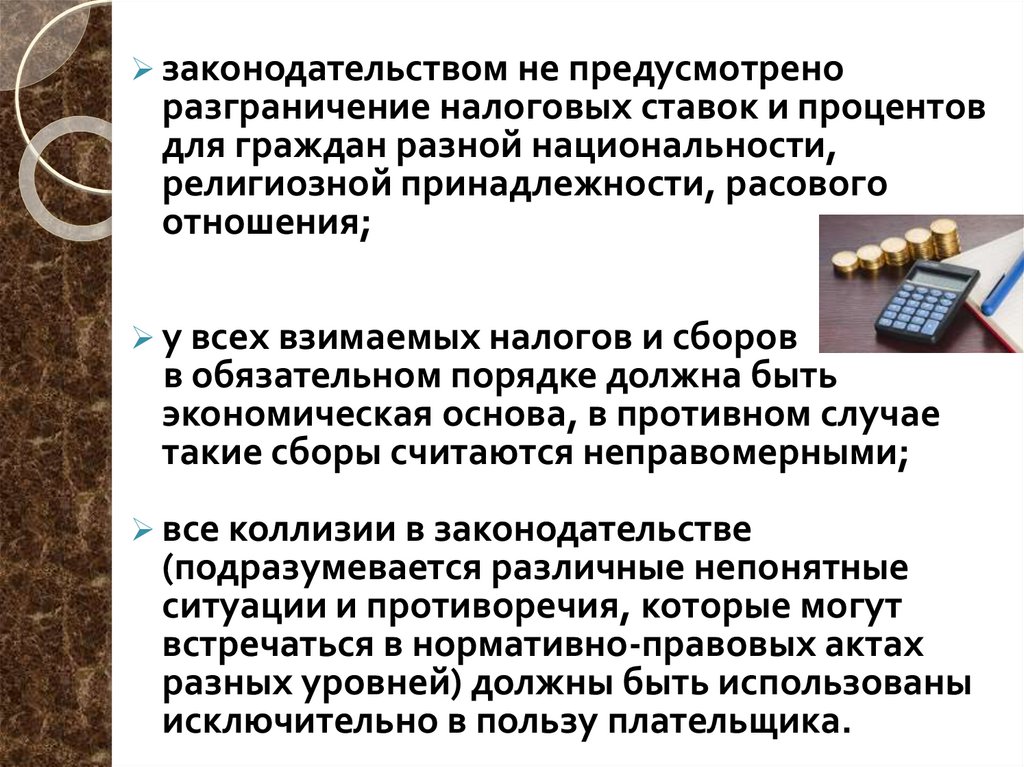 Статья 3 Налогового кодексапредусматривает следующие основы и