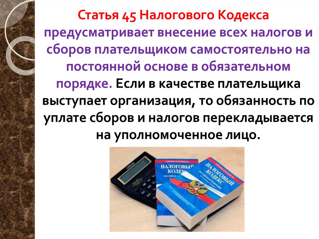 Статья 45 Налогового Кодексапредусматривает внесение всех налогов и