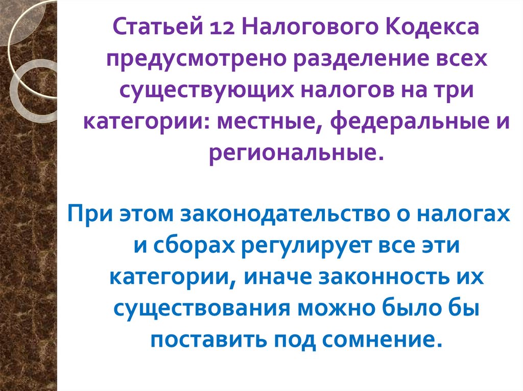 Статьей 12 Налогового Кодексапредусмотрено разделение всех
