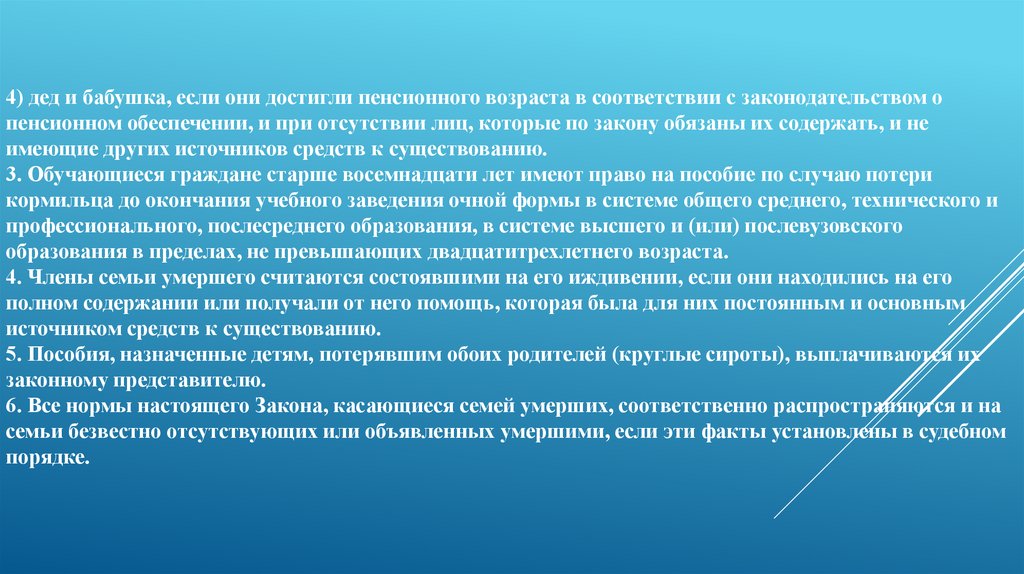 4) дед и бабушка, если они достигли пенсионного возраста в соответствии с законодательством опенсионном обеспечении, и при отсутствии лиц, которые по закону обязаны их содержать, и не