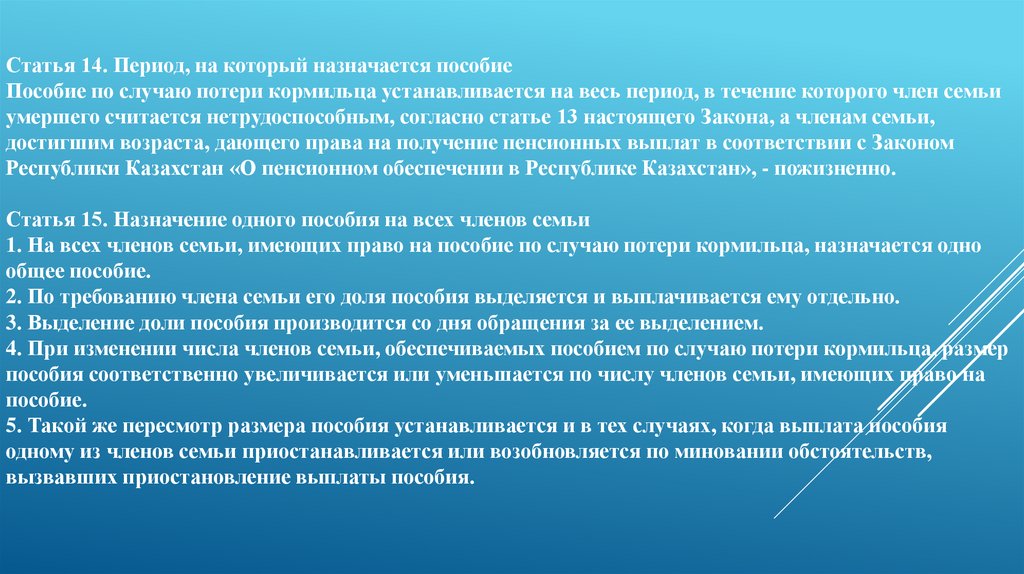 Статья 14. Период, на который назначается пособиеПособие по случаю потери кормильца устанавливается на весь период, в течение которого член семьи