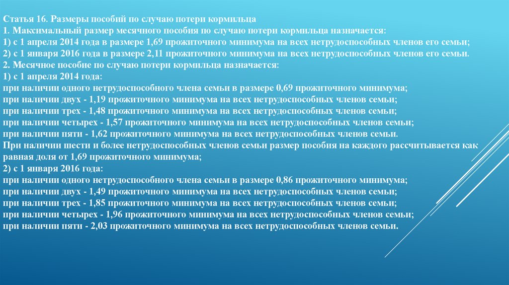 Статья 16. Размеры пособий по случаю потери кормильца1. Максимальный размер месячного пособия по случаю потери кормильца назначается: