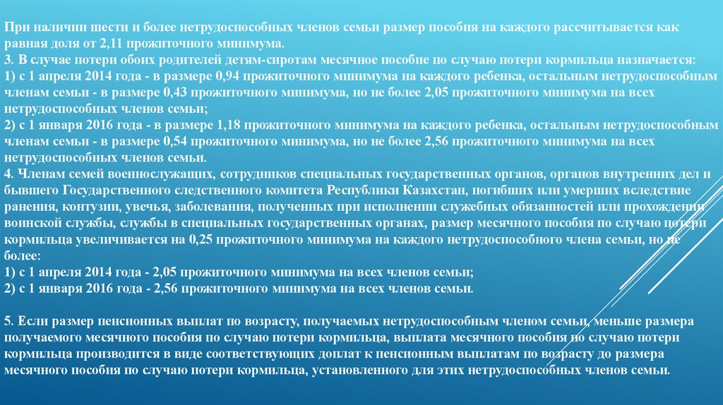 кормильца увеличивается на 0,25 прожиточного минимума на каждого нетрудоспособного члена семьи, но не