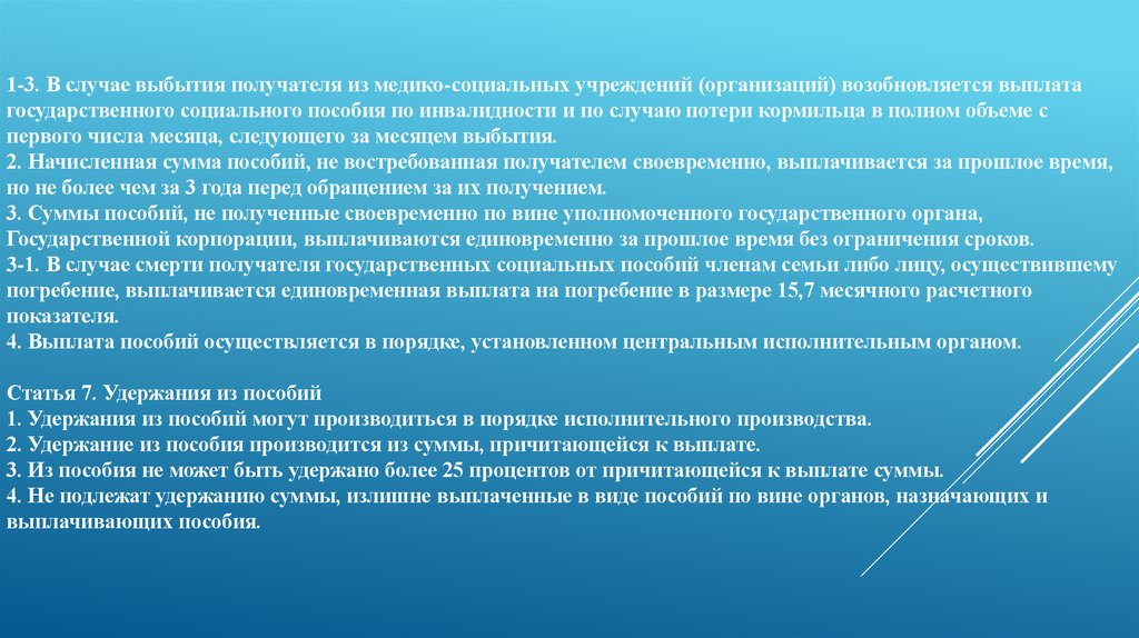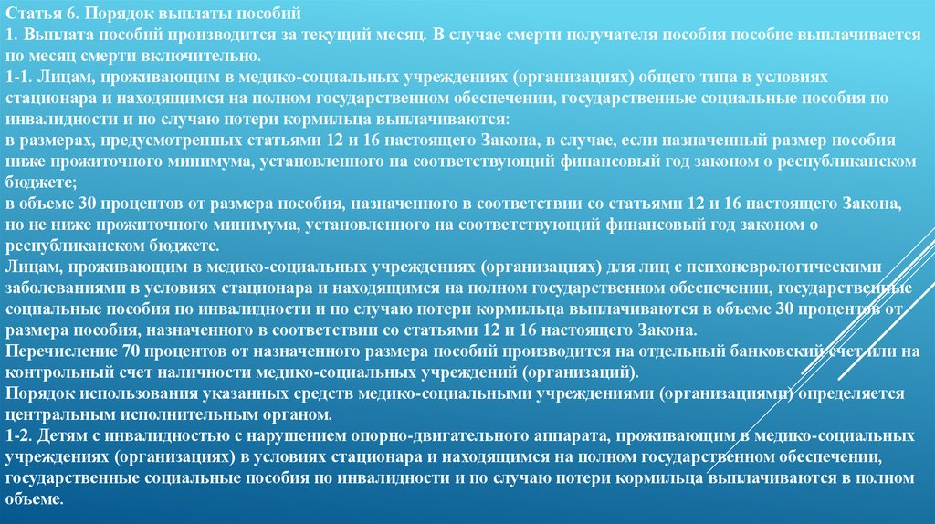 Статья 6. Порядок выплаты пособий1. Выплата пособий производится за текущий месяц. В случае смерти получателя пособия пособие выплачивается