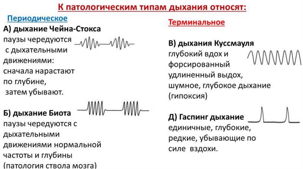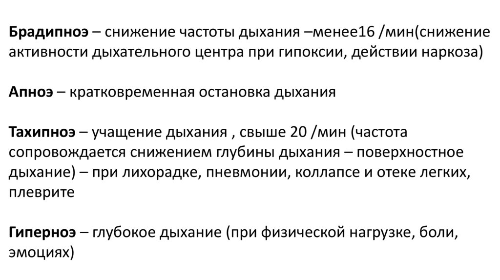 Брадипноэ – снижение частоты дыхания –менее16 /мин(снижениеактивности дыхательного центра при гипоксии, действии наркоза)