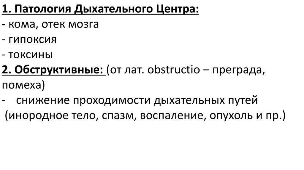 1. Патология Дыхательного Центра:- кома, отек мозга