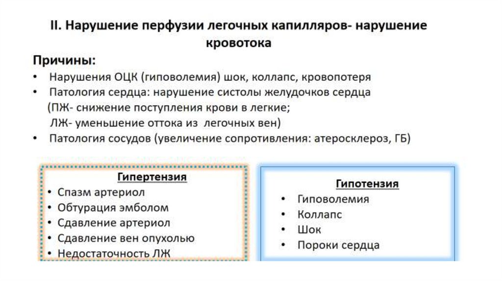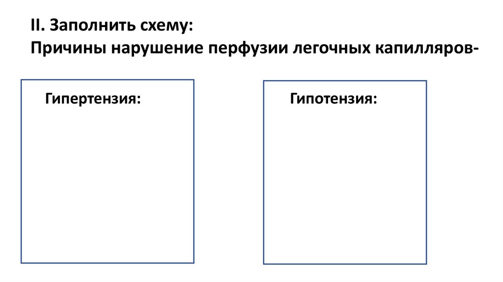 II. Заполнить схему:Причины нарушение перфузии легочных капилляровГипертензия: