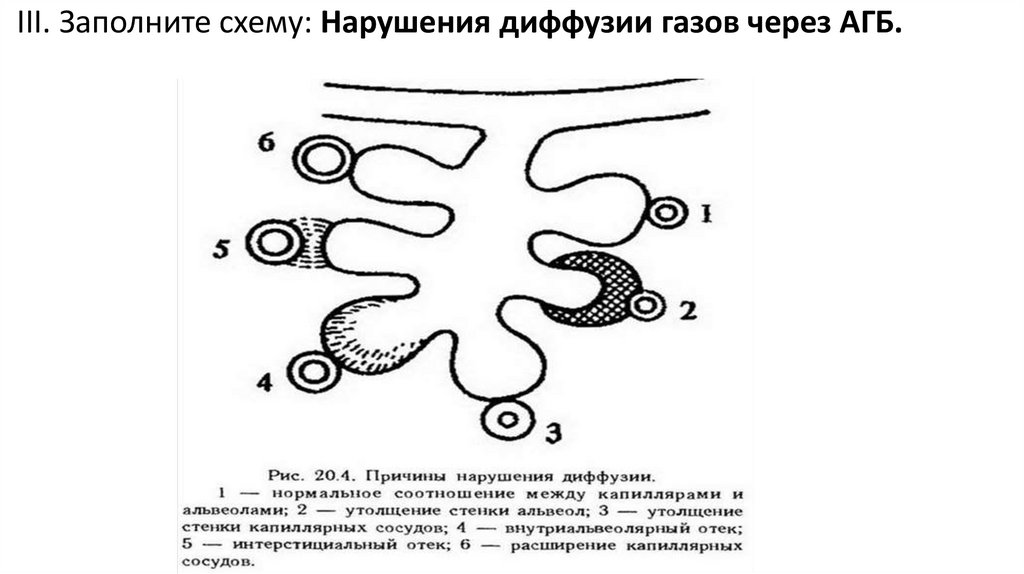 III. Заполните схему: Нарушения диффузии газов через АГБ.10.