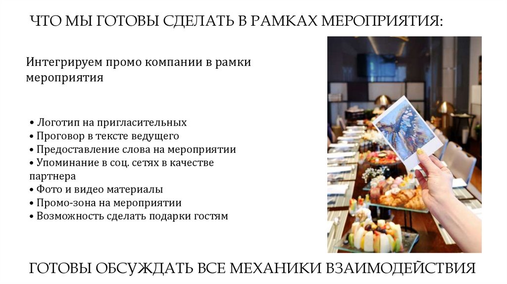 ЧТО МЫ ГОТОВЫ СДЕЛАТЬ В РАМКАХ МЕРОПРИЯТИЯ:Интегрируем промо компании в рамки