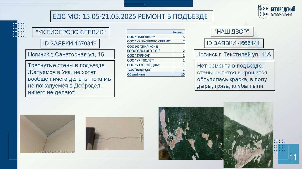ЕДС МО: 15.05-21.05.2025 РЕМОНТ В ПОДЪЕЗДЕ"УК БИСЕРОВО СЕРВИС"