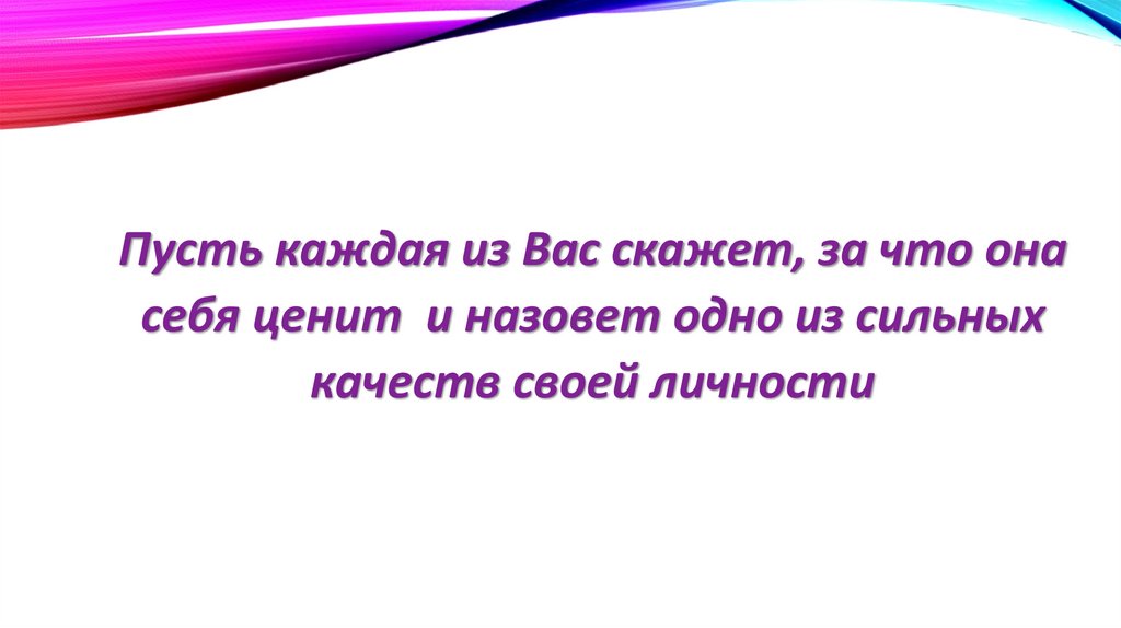 Пусть каждая из Вас скажет, за что онасебя ценит и назовет одно из сильных