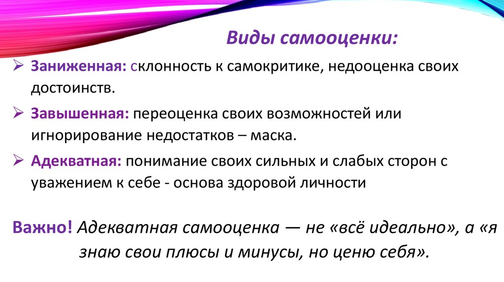 Виды самооценки:Заниженная: склонность к самокритике, недооценка своих
