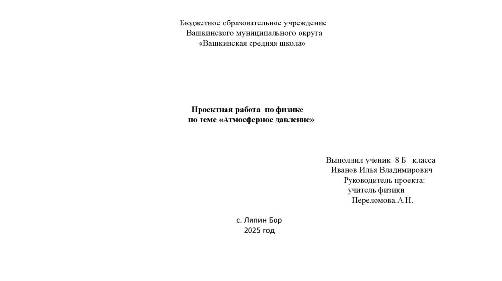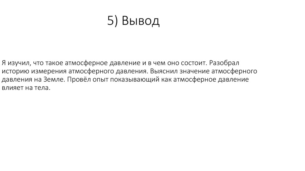 8. 5) Вывод Я изучил, что такое атмосферное давление и в чем оно состоит. Разобрал историю измерения атмосферного давления.