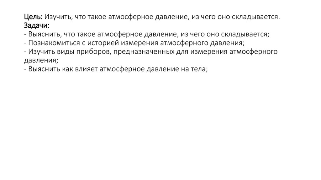 2. Цель: Изучить, что такое атмосферное давление, из чего оно складывается. Задачи: - Выяснить, что такое атмосферное давление, из