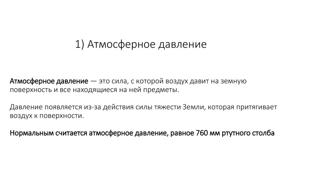 1) Атмосферное давлениеАтмосферное давление — это сила, с которой воздух давит на земную