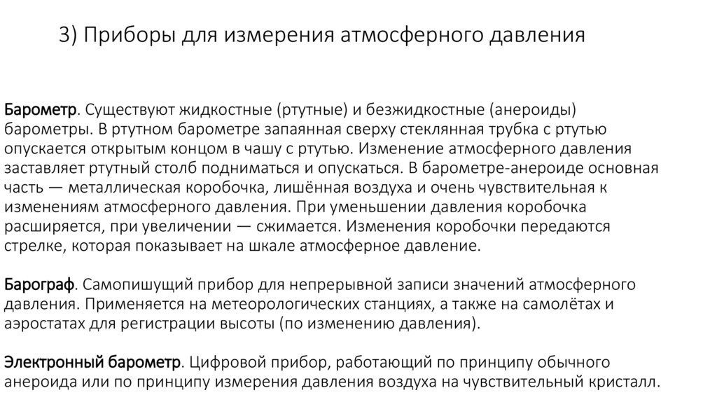 6. 3) Приборы для измерения атмосферного давления Барометр. Существуют жидкостные (ртутные) и безжидкостные (анероиды) барометры.