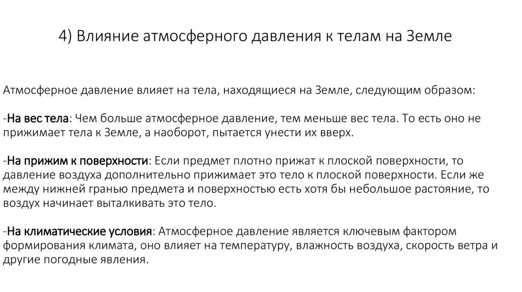 атмосферного давления.4) Влияние атмосферного давления к телам на Земле.