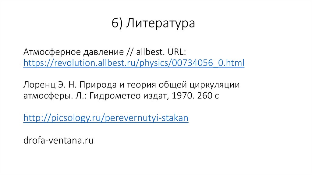 9. 6) Литература Атмосферное давление // allbest. URL: https://revolution.allbest.ru/physics/00734056_0.html Лоренц Э. Н. Природа