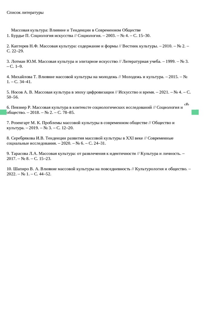 Список литературыМассовая культура: Влияние и Тенденции в Современном Обществе