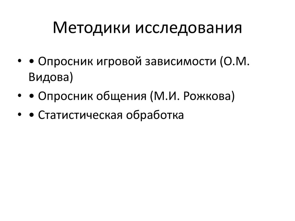 Методики исследования• • Опросник игровой зависимости (О.М.