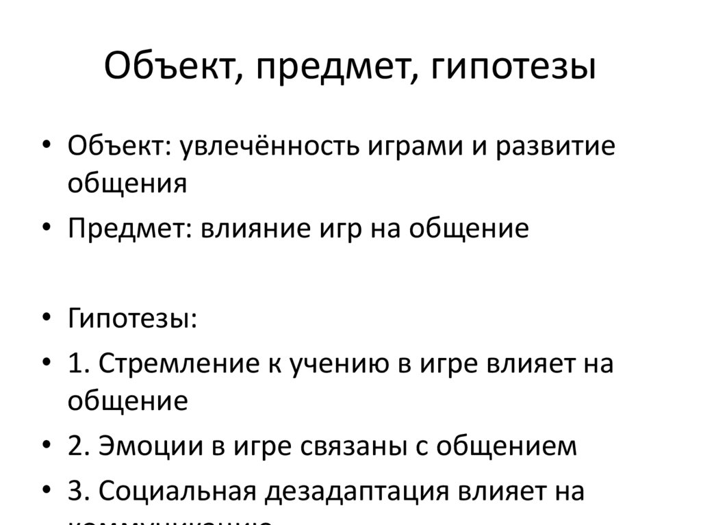 Объект, предмет, гипотезы• Объект: увлечённость играми и развитие