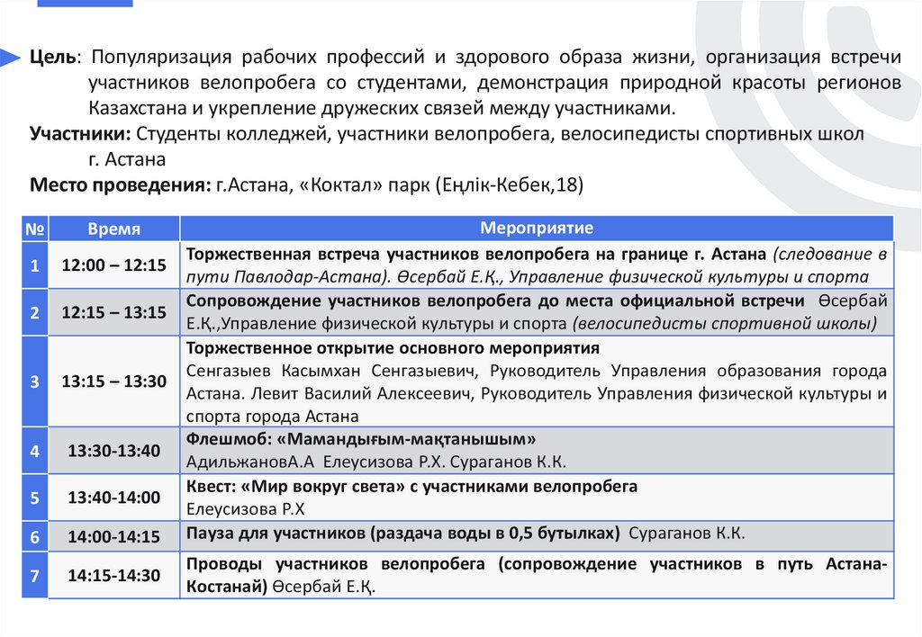 (студентов, любителей, велосипедистов ДЮС г. Астана), сопровождение до