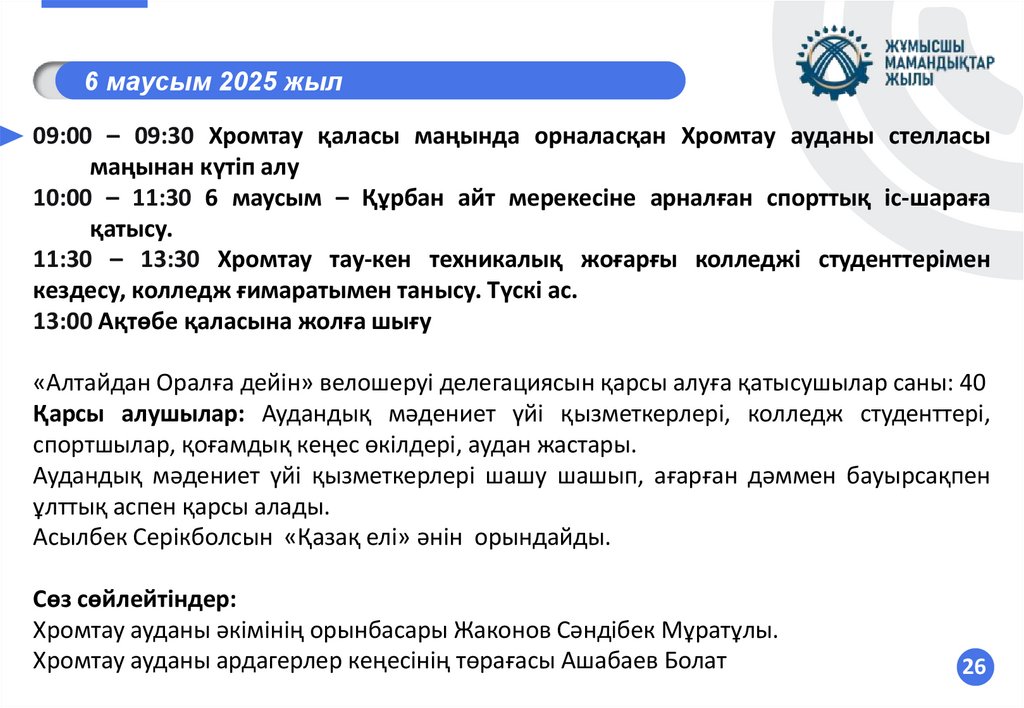 20:00 – Жымпиты ауылына келу. Сырым колледжінің студенттерімен, жас