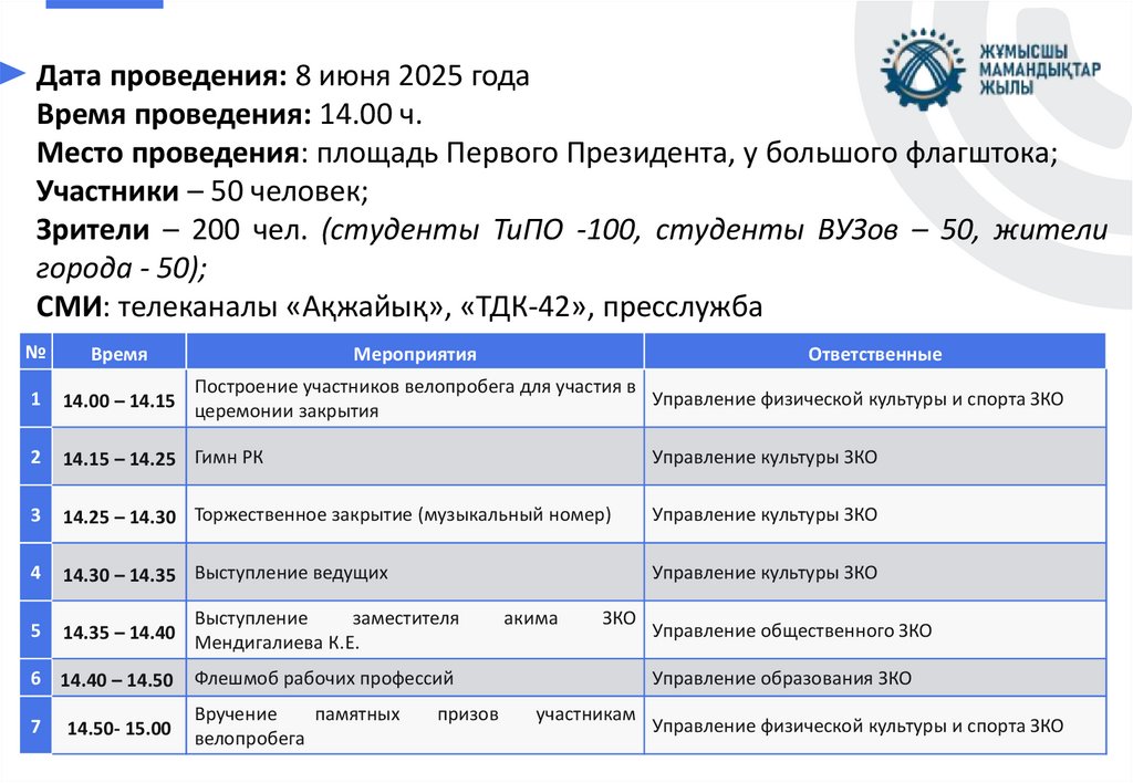 Қарсы алушылар: облыстық дене шынықтыру және спорт, білім, қоғамдық даму,