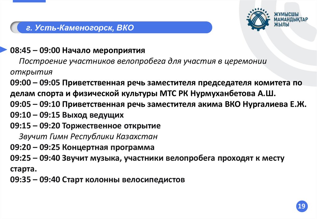 13:00 – 14.00 С.Датов көшесімен Тұңғыш Президент алаңына дейін жүру