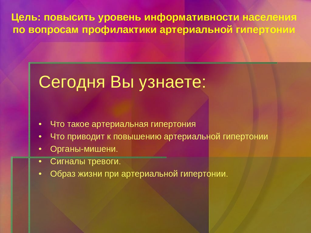 Цель: повысить уровень информативности населенияпо вопросам профилактики артериальной гипертонии
