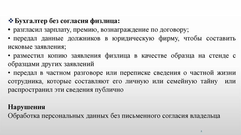 Бухгалтер без согласия физлица:• разгласил зарплату, премию, вознаграждение по договору;